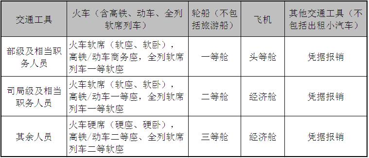 第七条 出差人员应当按规定等级乘坐交通工具。乘坐交通工具的等级见下表: